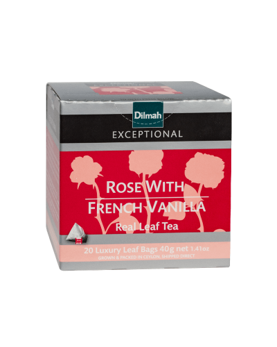 Dilmah Exceptional Rose with French Vanilla to połączenie czarnej herbaty cejlońskiej z delikatnym aromatem róży i francuskiej wanilii. Ta wyjątkowa herbata dostępna jest w formie 20 stożkowych biodegradowalnych torebek ekspresowych z zawieszką, co sprawia, że jej przygotowanie jest niezwykle proste.