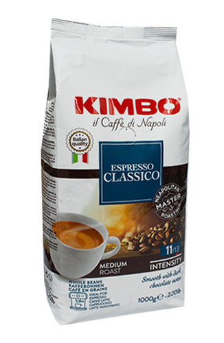 Kawa Kimbo Espresso Classico stanowi unikalne połączenie najdorodniejszych ziaren gatunku Arabica (70%), pochodzących z upraw Ameryki Południowej, ze starannie dobranymi odmianami wysokogatunkowej Robusty. Te ostatnie są odpowiedzialne za odpowiedni poziom kofeiny, gwarantujący pobudzające właściwości. Ciemny lub wręcz bardzo ciemny stopień palenia ziaren, zastosowany w Kimbo Espresso Classico, jest osiągany dzięki długotrwałemu i precyzyjnemu wypalaniu poszczególnych odmian, w stosunkowo wysokiej temperaturze. Proces ten pozwolił wyeliminować niepożądaną kwaskowatość, jednocześnie nadając kawie przyjemnej goryczki oraz wyrazistego smaku, z wyczuwalnymi nutami ciemnej czekolady.